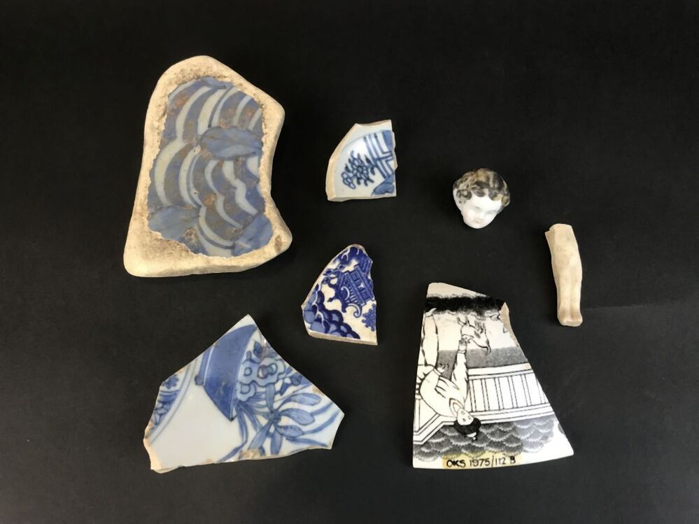 A: majolica schotelfragment uit Friesland met rozet in blauw-wit. B: Fragment van kom C: Fragment van bord, merkteken P. Regout A0 1836 Maastricht -in 2 ovalen D: Fragment van bord; Engels aardewerk (Nederlands)