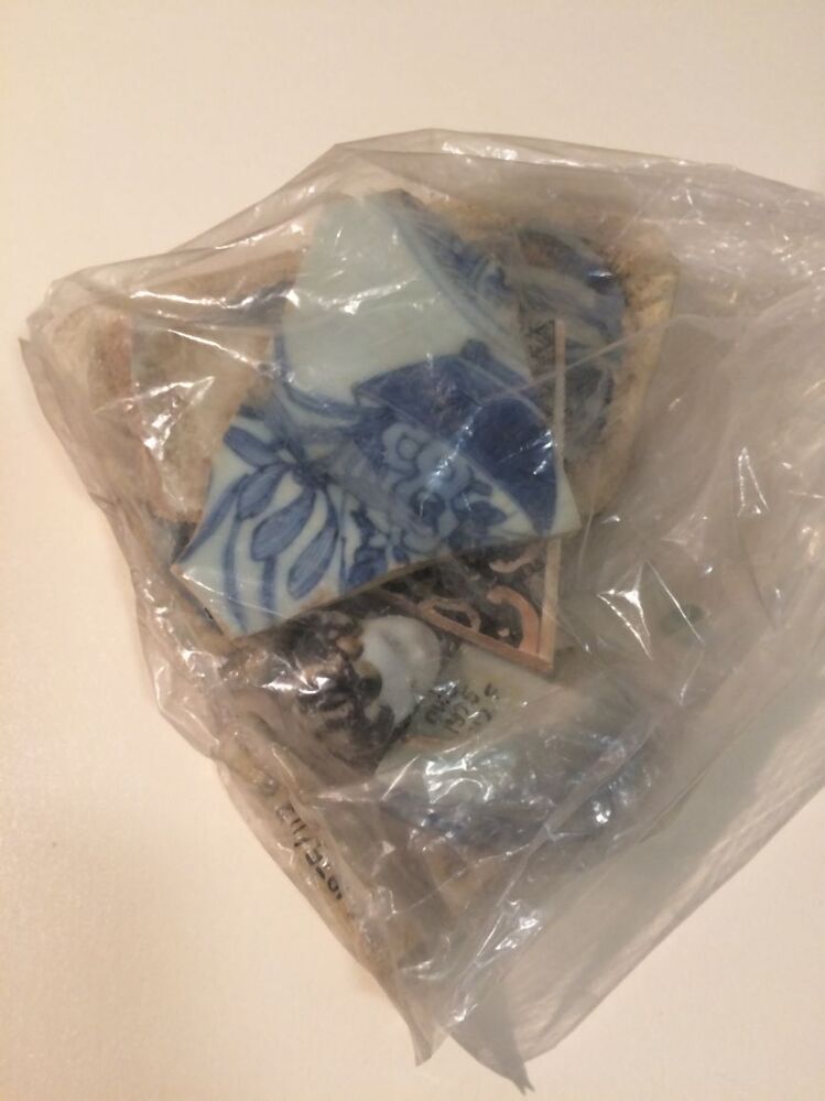 A: majolica schotelfragment uit Friesland met rozet in blauw-wit. B: Fragment van kom C: Fragment van bord, merkteken P....icht -in 2 ovalen D: Fragment van bord; Engels aardewerk||Suriname||(vindplaats)||Keramiekmuseum Princessehof QOKS 1975-112