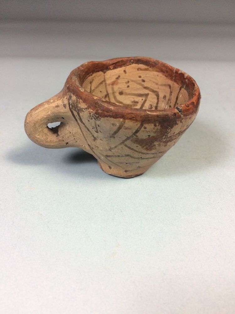 licht bolle bodem; bol spreidende wand; lusvormig oor van even onder rond tot onder het midden van de wand Materiaal: grijze scherf (door vermenging met klie met kwepi-as) exterieur: gedeeltelijlk bedekt met rode engobe en plantensap. Versiering: op wand in-en exterieur ornament van lijnen en stippen; brede band langs rand + uitlopende vlek (Nederlands)