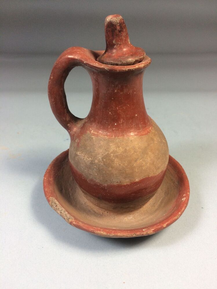 rechte bodem; bol spreidende wand; vanuit het plat verrijst kruik met bolle wand, verjongende hals, en spreidend randje vanwaar c-vormig oor naar schouder; dop met steelvormige knop boven spreidend randje en puntvormige afsluiting Materiaal: grijze scherf bedekt met gele engobe; rode band langs rand van schotel, over buik, hals, oor en dop (Nederlands)