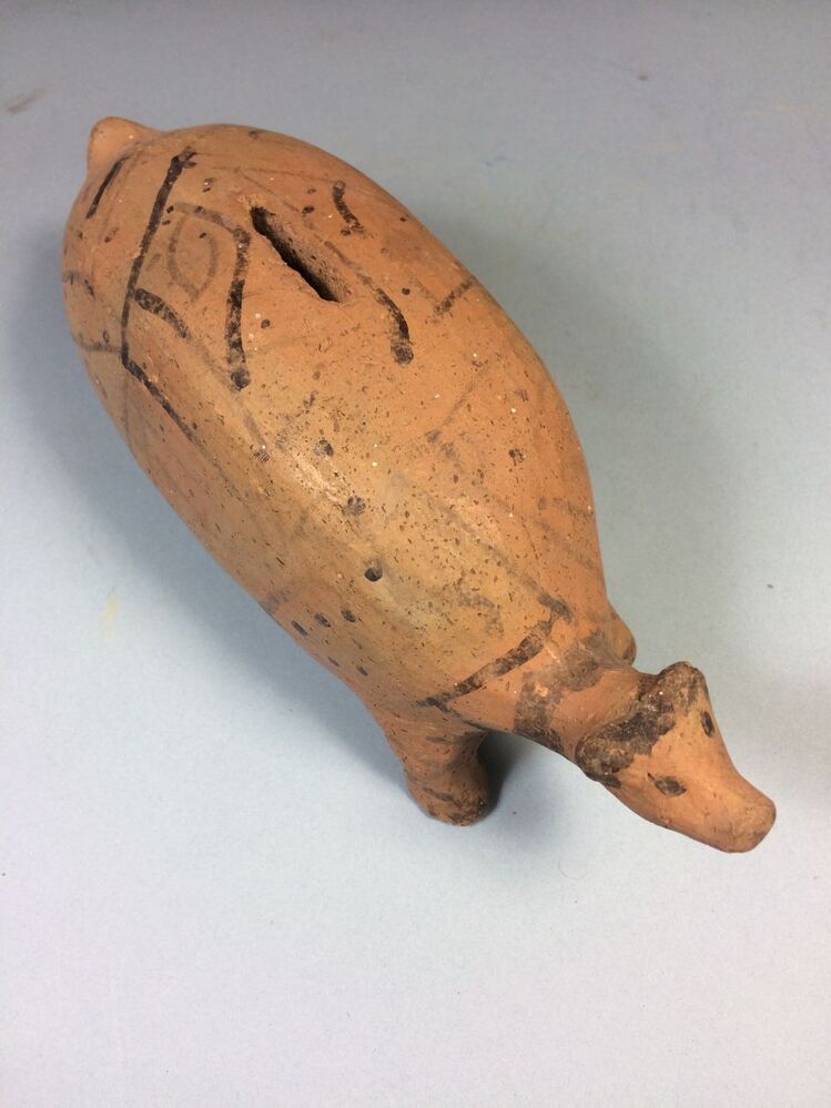 dier op 4 pootjes, stompe staart, groot lichaam, kleine (honde) kop Materiaal: rossig-gele scherf; beschildering met plantensap Versiering: ornament van lijnen en stippen op lichaam en poten, halsband, oren, ogen en bek (Nederlands)