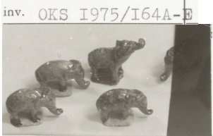 5 plastieken van olifanten, bedekt met groen en geel glazuur (Q21815)