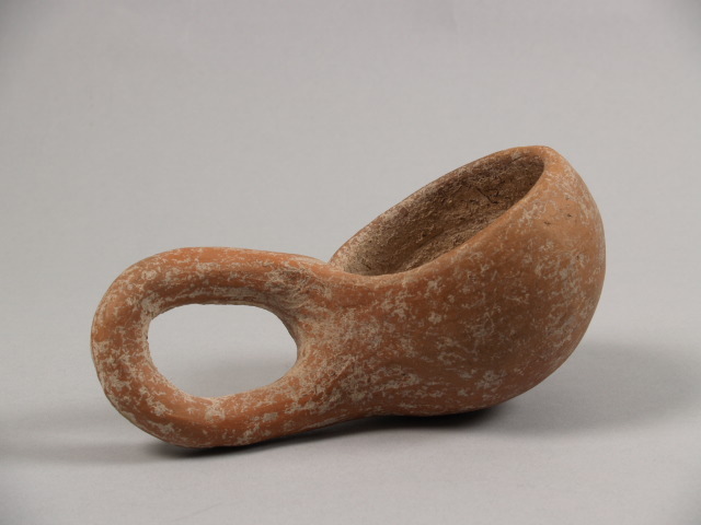 Bolle wand met van lip naar wand een rond, staand, ovaal oor.||Keramiekmuseum Princessehof OKS 1975-277 |