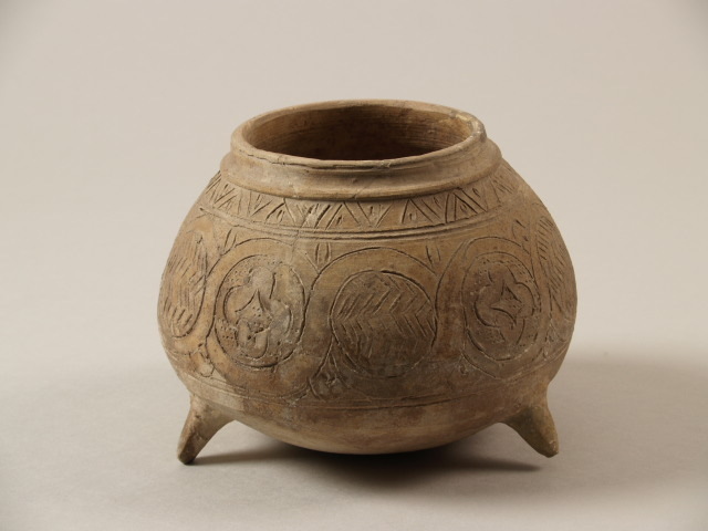 Pot met 3 poten en met decor van abstracte motieven, ongeglazuurd, pre-islamitische periode (Q21890)