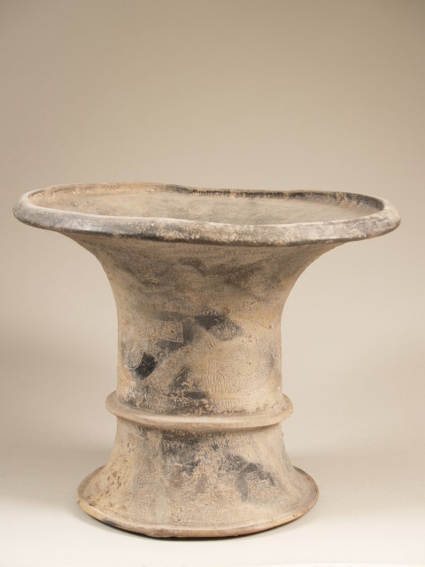 | Nederlands | Urn van grijs aardewerk met brede hals met decor van kraswerk en slib |