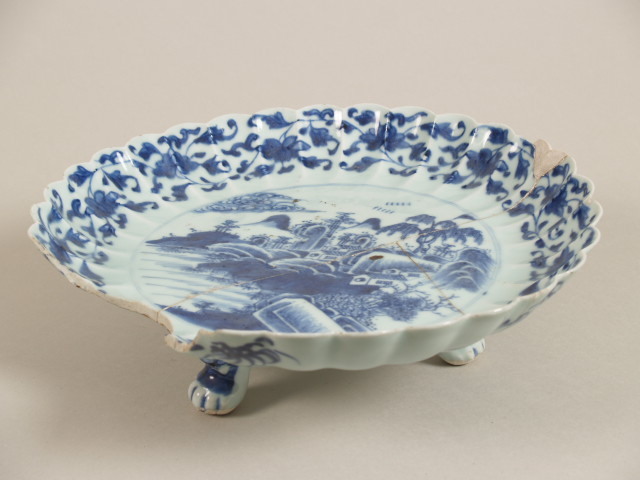 Schaal op 3 voetjes, met geschulpte rand en decor van rivierlandschap (Nederlands)