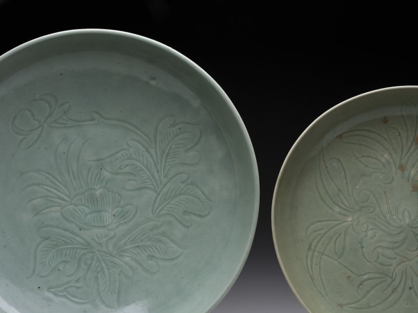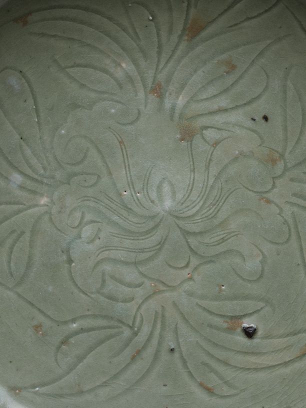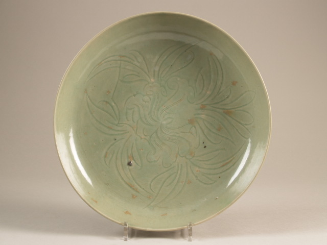 | Nederlands | Schotel met ingegrift decor van bloeiende plant, bedekt met bleek celadonglazuur |