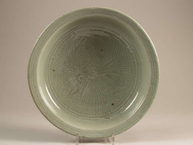 Schotel bedekt met groene glazuur. Op het plat een ingesneden decoratie van een bloem (mogelijk paulownia, kiri (桐) in het Japans) , omgeven door maenders. Langs de rand een geschulpt motief. Celadon, hasami, green-ware. Dit object is vervaardigd in de Hasami-ovens in Nagasaki aan het einde van de 17de eeuw. Deze ovens staan bekend om de productie van celadonobjecten voor dagelijks gebruik. Grote oplagen borden met ingesneden decoratie, zoals te zien is bij dit exemplaar, werden hier vervaardigd voor export naar Zuid-Oost Azië. (Nederlands)