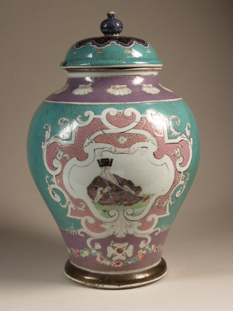 Ovale vaas met deksel fungerend als fontein beschilderd in diverse emailkleuren (paars, rood, geel, blauw, turkoois, zwart, roze, groen en wit) en gehoogd in goud. Het lichaam van de vaas aan twee kanten gedecoreerd met een geschulpte cartouche met een figuur. In één een zittende man die een pijp rookt. De figuur draagt hoed, een mantel en sandalen. De mantel is rijk versierd met figuratieve scènes in goud. In de andere cartouche is een Aziatische vrouw afgebeeld die een bord omhoog houdt. Ze is gekleed in een jurk met gouden bloemen. De ruimte tussen de panelen en de ornamentrand versierd met een ruitpatroon. Rond de cartouches is de ruimte versierd met een ruitpatroon. Rond de onderkant van de vaas twee guirlandes van bloemen. De voet versierd met een een zwarte band overeenstemmend met de zwarte versiering rond de knop van de deksel. Op de schouder van de vaas schelpvormen. Chine de commande, famille rose Het decor is naar ontwerp van Cornelis Pronk en staat bekend als 'de pijproker'. (Nederlands)