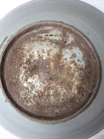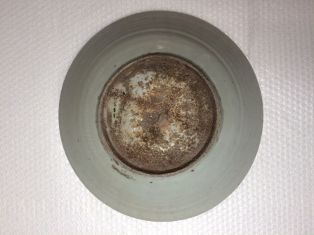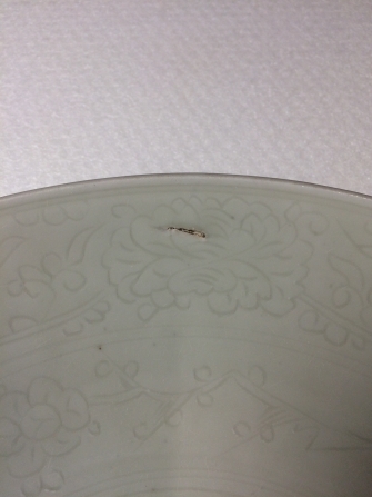 Schotel van porselein, bedekt met een grijswit glazuur. Versierd met een ingegrifte decoratie, met op het plat een qilin tussen vlammen en wolken. Op de wand tweemaal een vlam en tweemaal een bloemtak (prunus) met daarop een vogel. Op de rand een doorlopende bloemrank (pioen). Bakzand op de voetring. Zhangzhou (Swatow) (Nederlands)