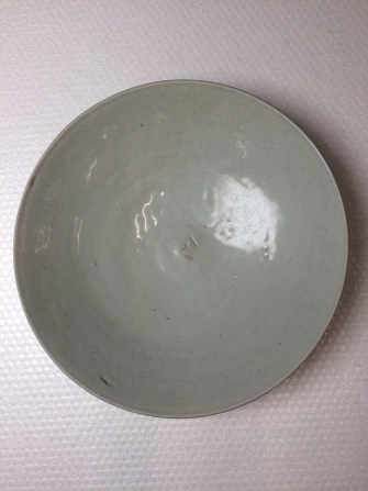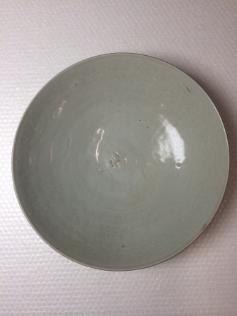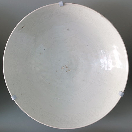Schotel met een monochroom wit glazuur en een ingegrift decor van een qilin. Zhangzhou ware (voorheen bekend als swatow). (Nederlands)