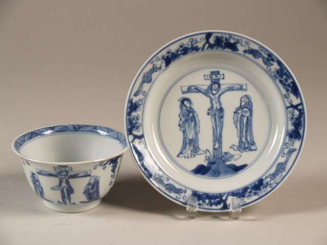 Kop en schotel met decor van de kruisiging van Jezus Christus, chine de commande (Q22016)