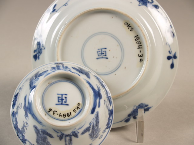 Kop en schotel op voetring met spreidende wand en rand, versierd in onderglazuur blauw. Op het plat van de schotel centr...en. De kop is voorzien van dezelfde beschildering als de schotel.||Jingdezhen||Keramiekmuseum Princessehof OKS 1984-003.A-B