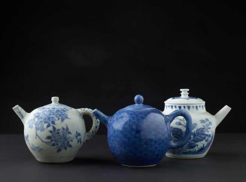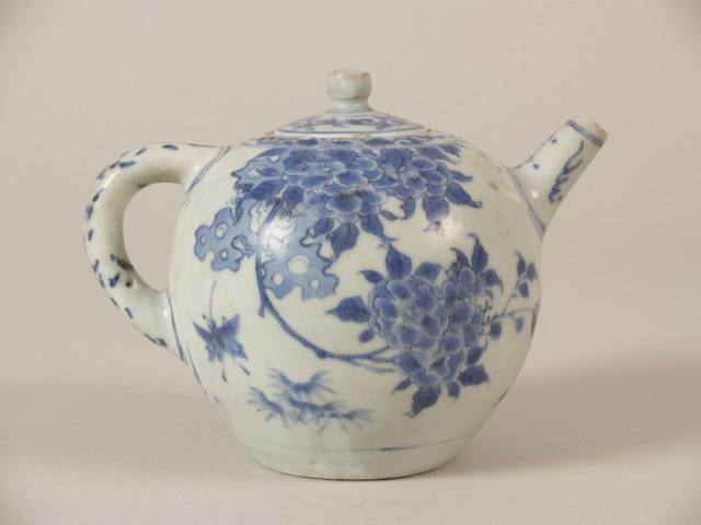 Bolvormige theepot van porselein met korte, rechte tuit, c-vormig oor en plat deksel met knop, beschilderd in onderglazu...rblijfselen van de zeebodem op de onderzijde. Blauwwit, Hatcher cargo.||China||Keramiekmuseum Princessehof OKS 1984-041.A-B