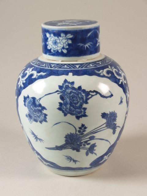 Pot met op de buik twee uitgespaarde voorstellingen binnen twee grote bladvormige cartouches met een magnolia, pioenroos en lotus. De tussenruimte is beschilderd in blauw met een 'cracked ice' patroon waaruit krullende ranken zijn uitgespaard. Rond de schouder een band met driehoek motieven.De deksel versierd met bloemen op een blauwe ondergrond. (Nederlands)