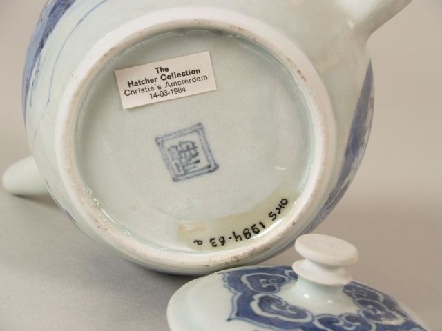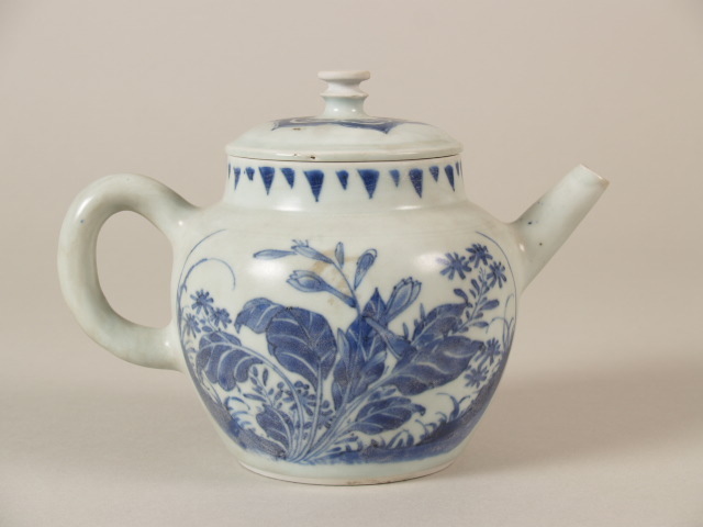 Bolvormige theepot van porselein met een rechte tuit, c-vormig oor en licht gewelfde deksel met knop, beschilderd in onderglazuur blauw. Op de wand gedeocreerd met een rivierlandschap met rotsen, bomen en twee figuren, waarvan één een visser. Aan de andere zijde grote, bloeiende planten (gouden lotusbanaan). Op de nek een band met afhangende driehoeken. Op de deksel een band ruyi-motieven. Blauwwit, Hatcher Cargo. (Nederlands)