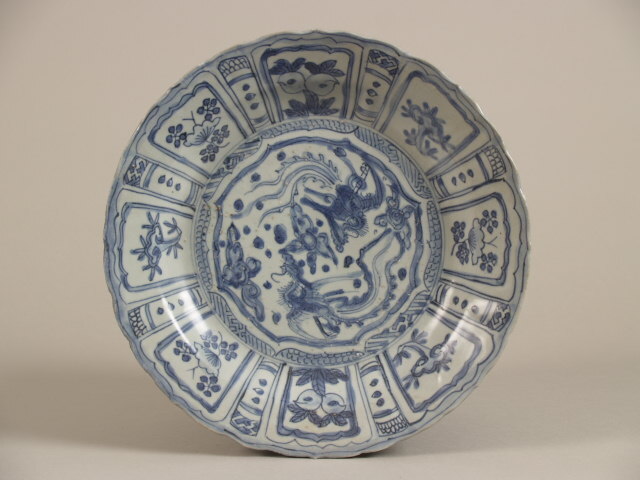 Schotel met geschulpte rand en decor van 2 feniksen omgeven door vakken met bloemen en symbolen (Nederlands)