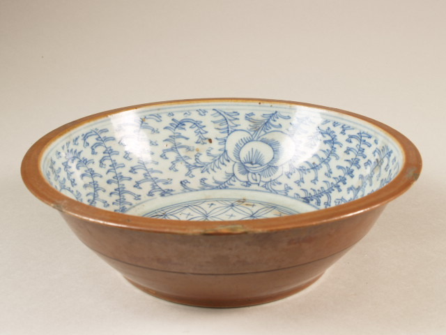 Bak met aan binnenkant gestreept decor in onderglazuurblauw met bloemen en aan buitenkant donkerbruin geglazuurd (Q22046)