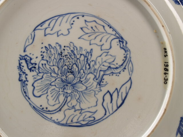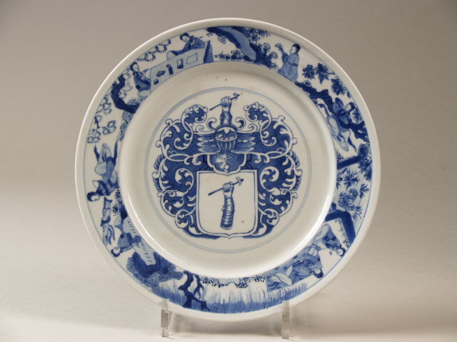 Bord in onderglazuur blauw gedecoreerd met op de rand een doorlopende landschapsscène met rotsen, bomen en Chinese dames. Op het plat is het wapen is van Johannes Camphuijs (1634-1695) afgebeeld. Het wapen bestaat uit een geheven arm in harnas met in de hand een hamer, het helmteken draagt hetzelfde motief. Rondom het wapen is gestileerd bladwerk aangebracht, deels uitgespaard tegen een blauwe grond. (Nederlands)
