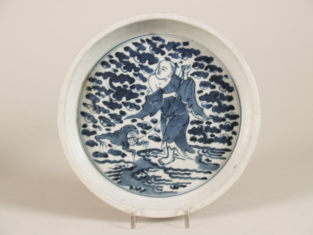 Schotel beschilderd in onderglazuur blauw met in het plat een decoratie van Liu Hai met zijn driepotige omgeven door wol.... Liu Hai en de pad vormen een symbool voor een lang leven.||China||Fujian||Dehua||Keramiekmuseum Princessehof OKS 1986-035
