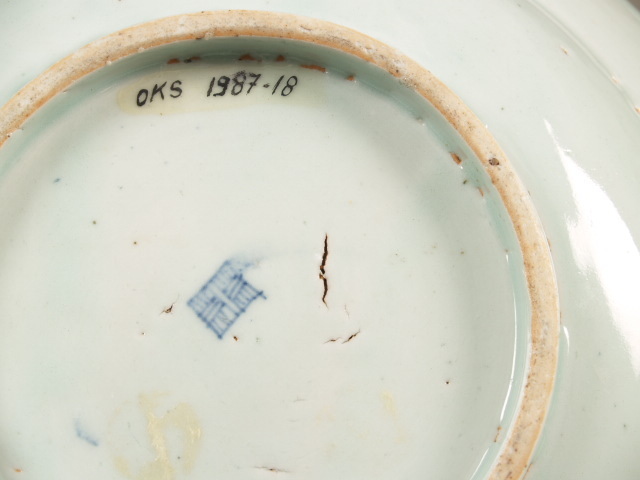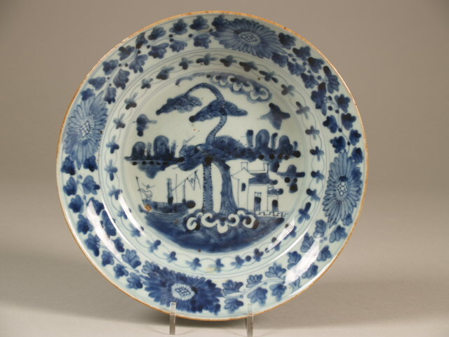 Bord beschilderd in onderglazuur blauw. Op het plat in het centrum een pijnboom met aan de linkerzijde een figuur in een...bloemen- en bladranken. Op de onderkant een imitatie vierkant-merk.||Japan||China||Keramiekmuseum Princessehof OKS 1987-018