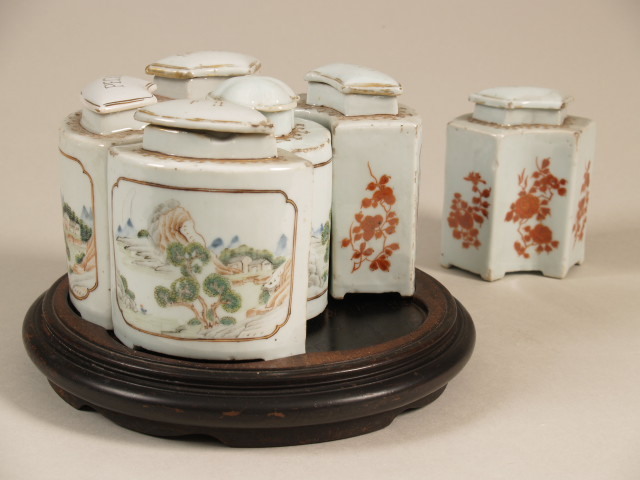 Een set van zes potjes om verschillende soorten thee in te bewaren op houten voetstuk. Het bestaat uit vijf rondlopende potjes rond één midden potje. Het is een Europees ontwerp, de potjes zijn aan de buitenkant versierd met landschappen in encre de chine, ijzerrood, twee kleuren groen en bovenglazuur blauw; in een goud met bruin kader. De deksels hebben gouden randjes en namen als Pedko, de zij- en achterkanten van de vijf hoekige potjes zijn versierd met een ijzerrode bloementak met verguldsel. Het geverfde centrale potje is versierd met landschappen. (Nederlands)