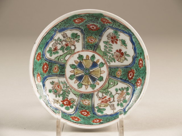 Schotel met polychroom decor van vlakken waarin bloemtakken (Nederlands)