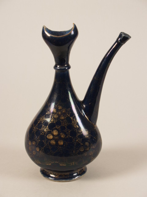 Kendi met lange tuit en halvemaanvormige mondrand en met decor in blauw en gehoogd in goud (Nederlands)