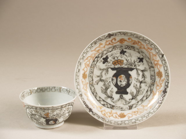 Kop en schotel met decor van medaillons met bloemen (Nederlands)