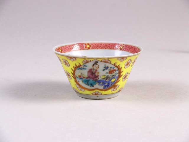 Kop en schotel met polychroom decor van zittende figuren (Nederlands)