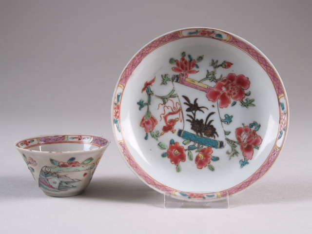 Kop en schotel met decor van bloemen, famille rose (Q22123)