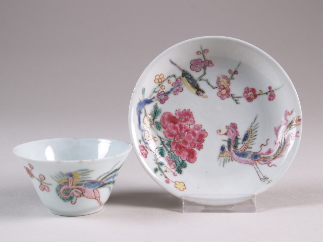 Kop en schotel met decor van bloemen en vogels, famille rose (Q22125)