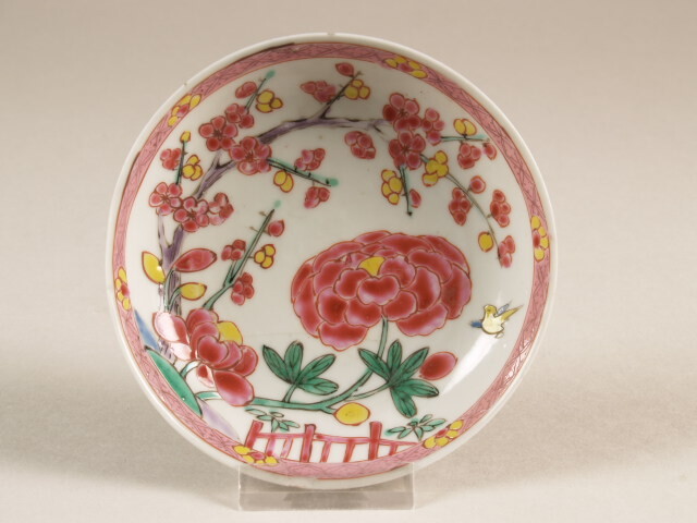 | Nederlands | Schotel, onderdeel van kop en schotel met polychroom decor van roze bloemen en prunus |