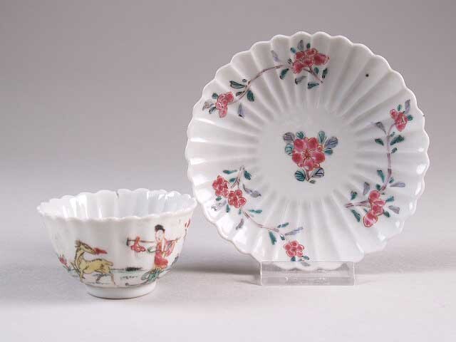 Kop en schotel, rozetvormig gegolfd, met decor van bloemen op wit fond, famille rose, horen niet bij elkaar (Nederlands)