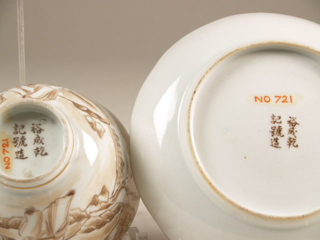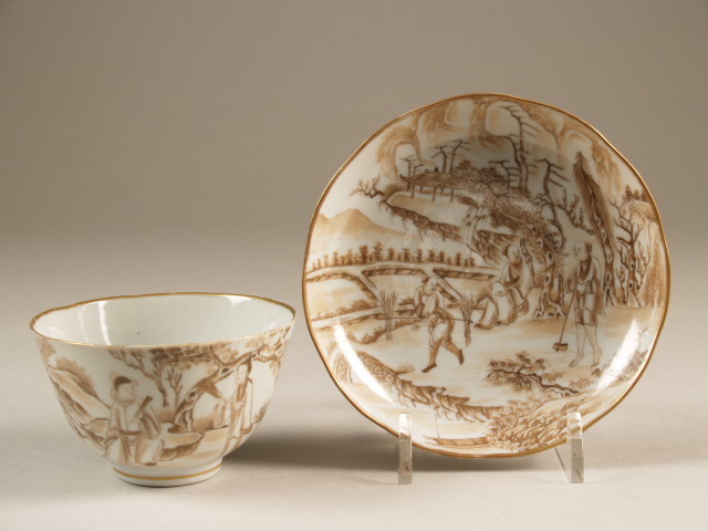Kop en schotel met bruin decor van landschap met veel figuren (Nederlands)