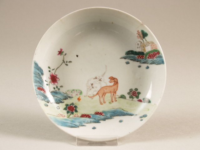 Schoteltje met polychroom decor van 2 honden in een landschap (Nederlands)