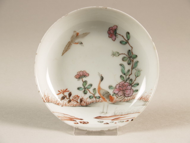| Nederlands | Schoteltje met decor van 2 kraanvogels en bloemen, famille rose |