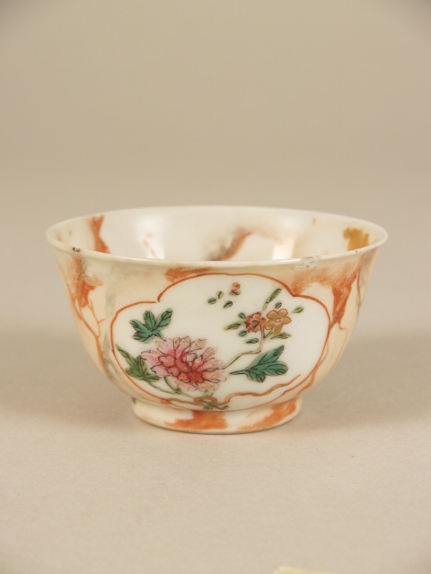 | Nederlands | Kop met decor van panelen en bloemen op gemarmerde ondergrond, famille rose / faux-bois |