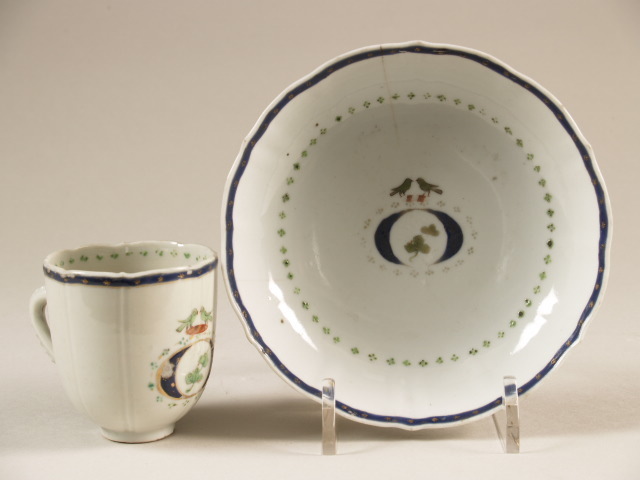 Kop en schotel met polychroom decor van medaillon dan wel wapenschild, chine de commande (Nederlands)