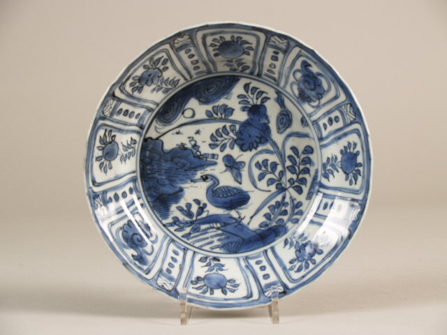 Bord met decor van rivierlandschap met eend op rots (Q22271)
