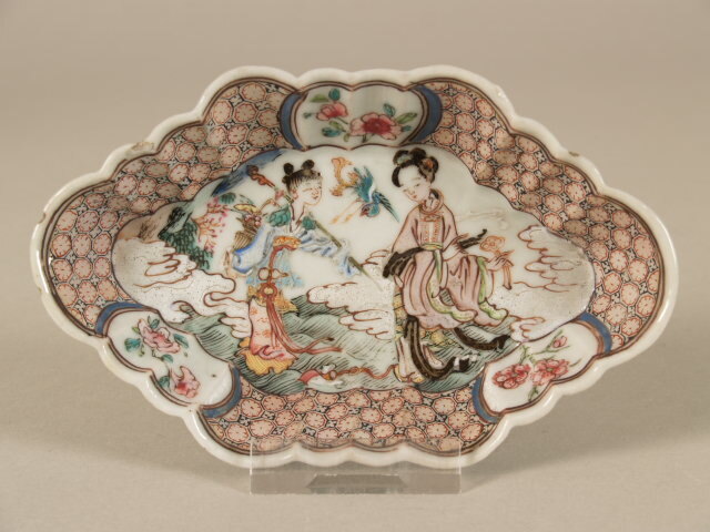 Pattipan met decor van 2 vrouwen staande op blad dat in zee drijft, famille rose (Nederlands)