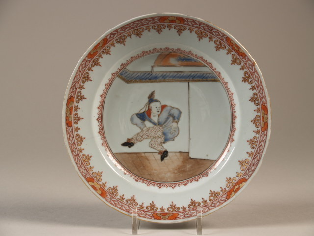 Bord beschilderd op het glazuur in rood, zwart, blauw en goud. Op het plat staat voor een muur een dansende figuur gekle... aan de windhandel van 1720. Zie ook NO 00891 en in de FM collectie QLY00594.||China||Keramiekmuseum Princessehof NO 00890 |