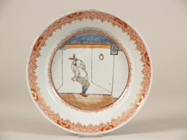 Bord beschilderd in bovenglazuur ijzerrood en emailkleuren en gehoogd in goud. Op het plat voor een muur een figuur met een broek, kousen en veren op zijn hoofddeksel. Rond het plat een staande ornamentrand. Langs de rand een band met halve bloemen op een ruitpatroon met eronder een ornamentrand. chine de commande, melk en bloed Deze voorstelling is afgeleid van een afbeelding op één van de zogenaamde Actiebordjes die beschreven is met de tekst 'Pardie al mijn Actien kwijt'. Deze bordjes met een overwegend ijzerrode versiering zijn niet beschreven met een tekst. De decoraties van deze borden zijn veelal gebaseerd op een kaartspel uit 1720 die meestal onderdeel zijn van Het Groote Tafereel der Dwaasheid (zie o.a. Rijksmuseum, http://hdl.handle.net/10934/RM0001.COLLECT.477726). Elke kaart heeft een voorstelling en versje gerelateerd aan de windhandel van 1720. Zie ook NO 00890 & NO 01090 en in de FM collectie QLY00594. (Nederlands)
