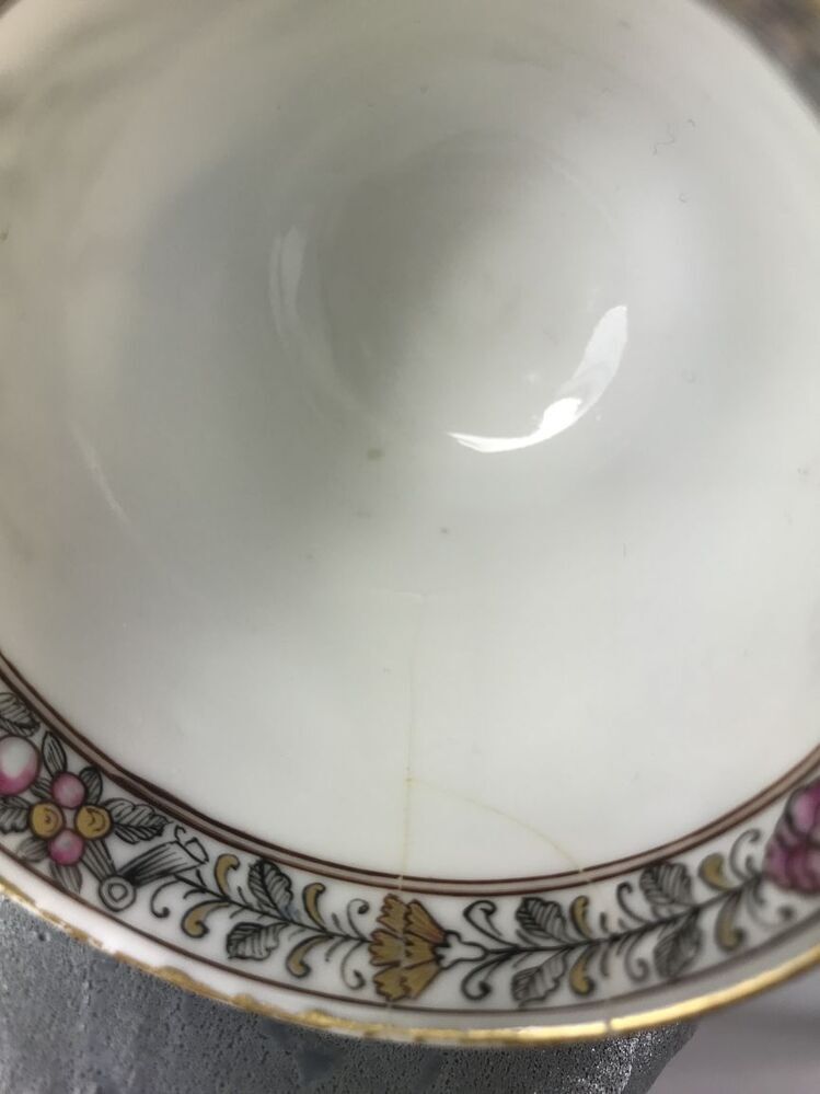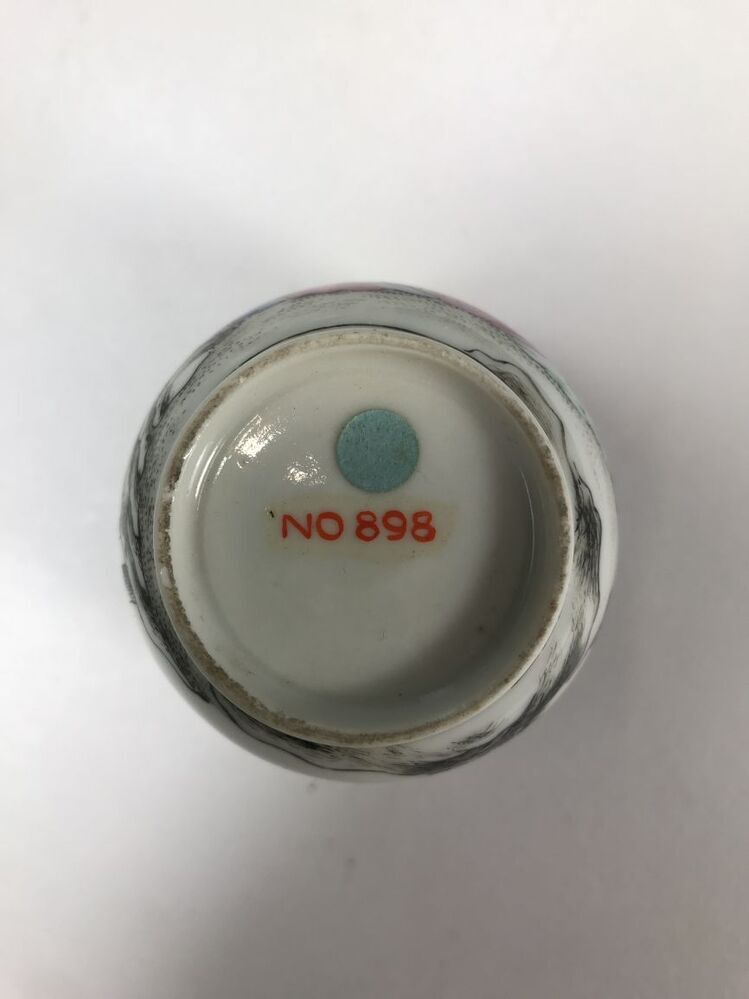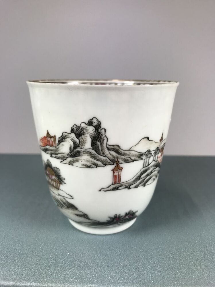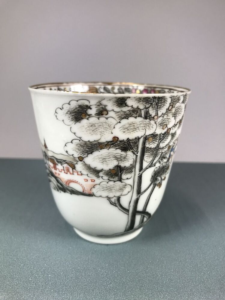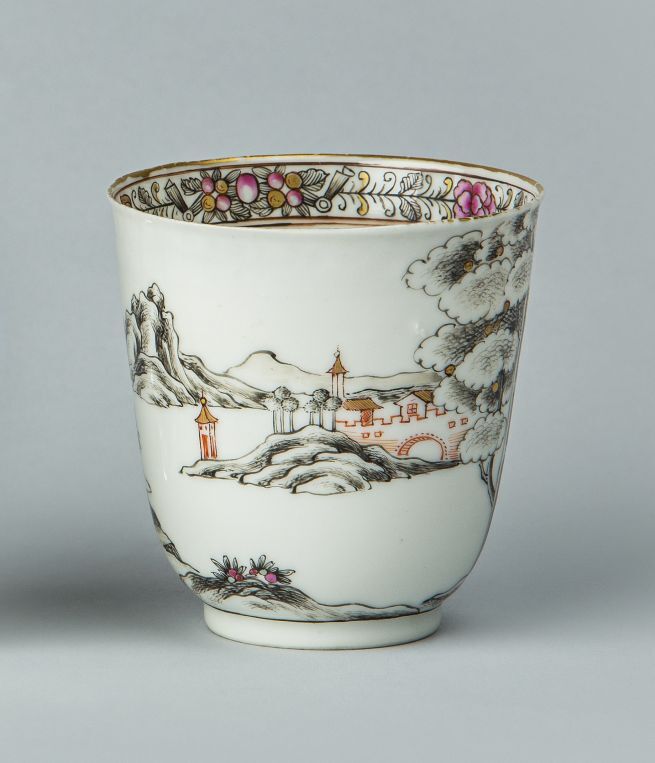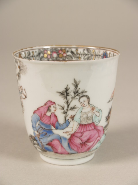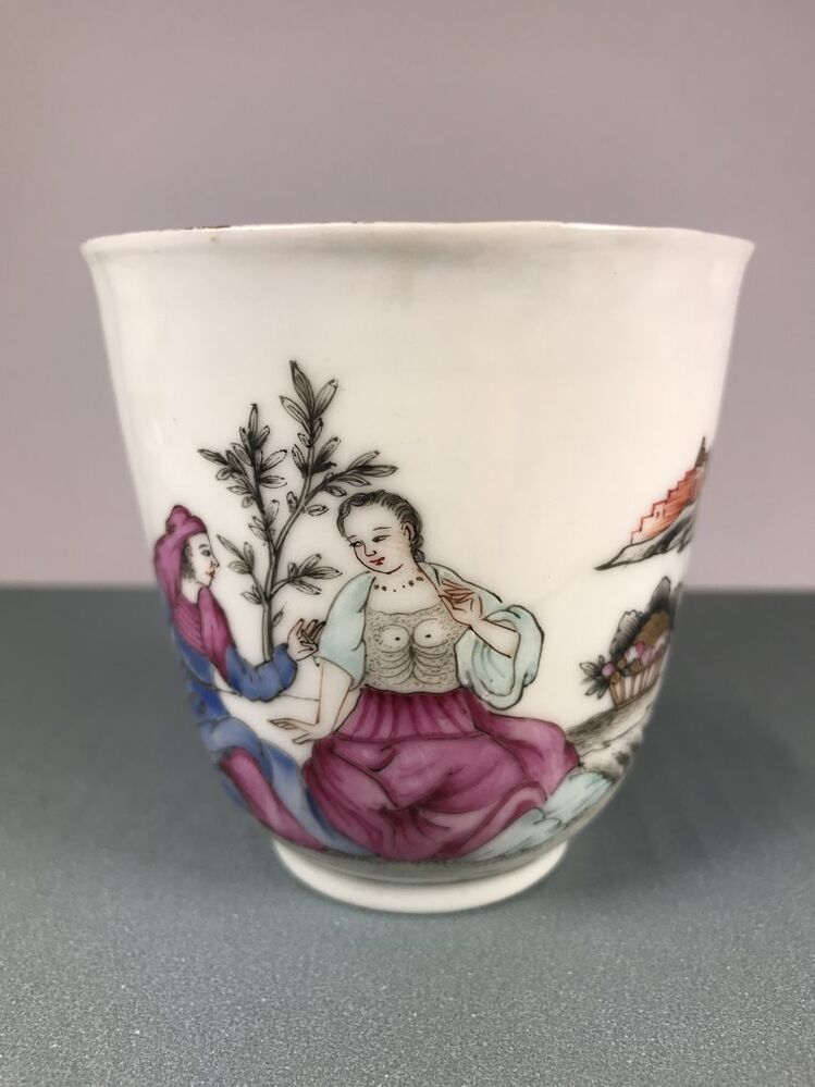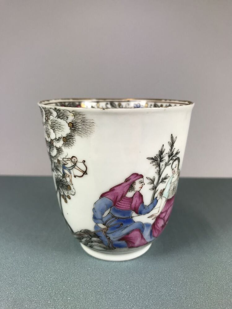 Hoge kop op voetring met rechte wand en rand. Versierd in bovenglazuur emails en encre de chine met een voorstelling naar Europees ontwerp. Aan de buitenkant van de kop is een rotsachtig landshap geschilderd met Europese architectuur. Temidden hiervan zijn twee vrouwen afgebeeld, een jonge en een oude. Naast de jonge vrouw staat een fruitmand. Beide dames zijn gekleed in westerse kledij. Onder de boom een zwevende cupido die een pijl op de jonge vrouw schiet. De twee vrouwen op deze voorstelling stellen Vertumnus en Pomona voor. Vertumnus is vermomd als oude vrouw die de jonge Pomona probeert te verleiden onder toeziend oog van Cupido. (Nederlands)