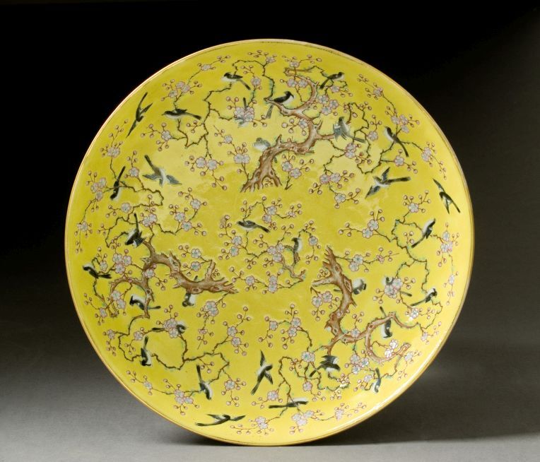Bord met op de bovenzijde drie grote en een kleine bloeiende prunusbloesem met dertig eksters. Aan de onderzijde drie bloemen en bladerranken. De liprand is verguld. De decoratie is uitgevoerd in famille roze emailkleuren met aan de voorzijde een geheel gele ondergond. Dit bord heeft een symbolische betekenis: eksters zijn staan in China symbool voor voorspoed en komen dan ook veel voor als decor op Chinees porselein, vooral in de Qing-dynastie (1644-1911). De eerste karakters van de naam van de vogel, xique, klinken hetzelfde als xi, geluk. Eksters kunnen worden toegevoegd aan een wens voor een gelukkig huwelijk, succes bij een examen of om rijk te willen worden. Zij dragen dan de boodschap in zich dat dit succes ‘bereikt zal worden’. Mei, prunus, klinkt hetzelfde als mei, wenkbrauw. De combinatie van eksters en prunus betekent ‘geluk zal zo hoog reiken als de wenkbrauw’, dat wil zeggen ‘geluk zonder einde’. Op dit bord staan 30 eksters afgebeeld, een voor elke dag van de maand. Daarmee wordt de wens verbeeld dat ‘veel gelukkige zaken je overkomen, elke dag van de maand’. (Nederlands)
