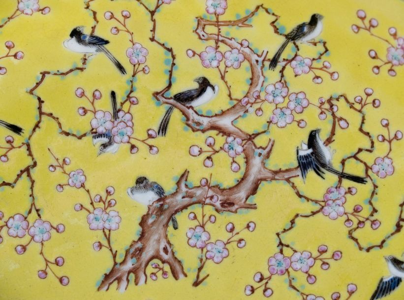 Bord met decor van eksters en prunus op geel fond, famille rose (Nederlands)
