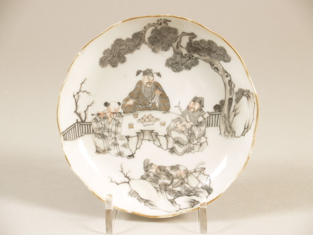 Schotel met decor van 4 figuren rond de tafel onder een pijnboom, encre de chine (Nederlands)