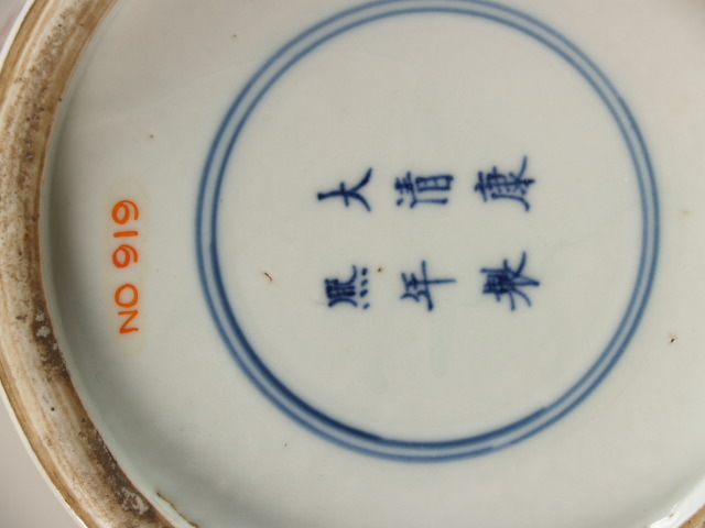 op de bodem in kobaltblauw vertikaal zesmerk Kangxi in dubbele ring (Nederlands)
