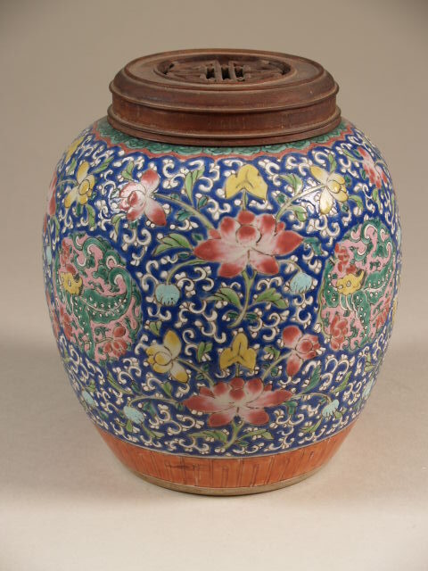 Pot met houten deksel met polychroom decor van bloemen in dikke emailles (Nederlands)