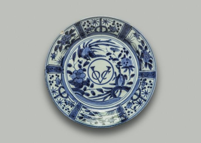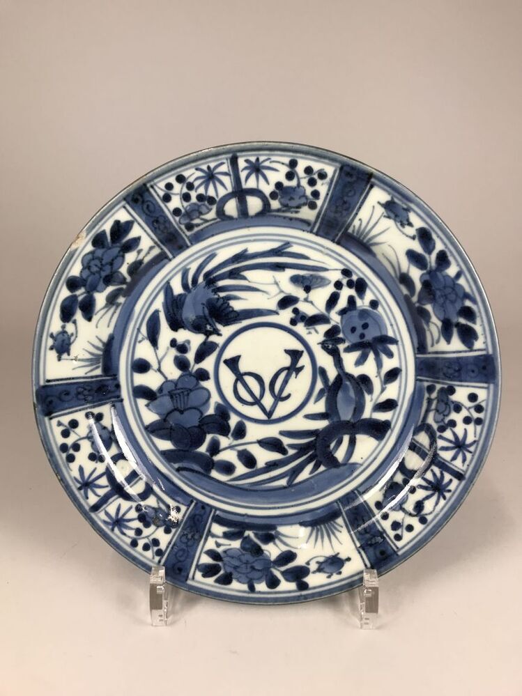 Bord met monogram van de VOC, vogels, bloemen en planten (Nederlands)